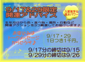 ・9/29の開運アドバイスは9/28お昼頃までにご入金確認ができるようにお願いします。